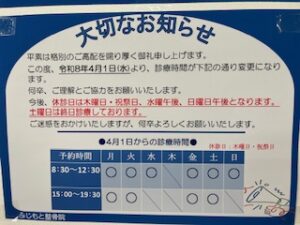 3月 16, 2026 / 最終更新日 : 3月 16, 2026 fujimoto-seikotsu お知らせ ~お知らせ~ 3月23日(月)は休診とさせていただきます。 ご迷惑をおかけいたしますが、よろしくお願いいたします